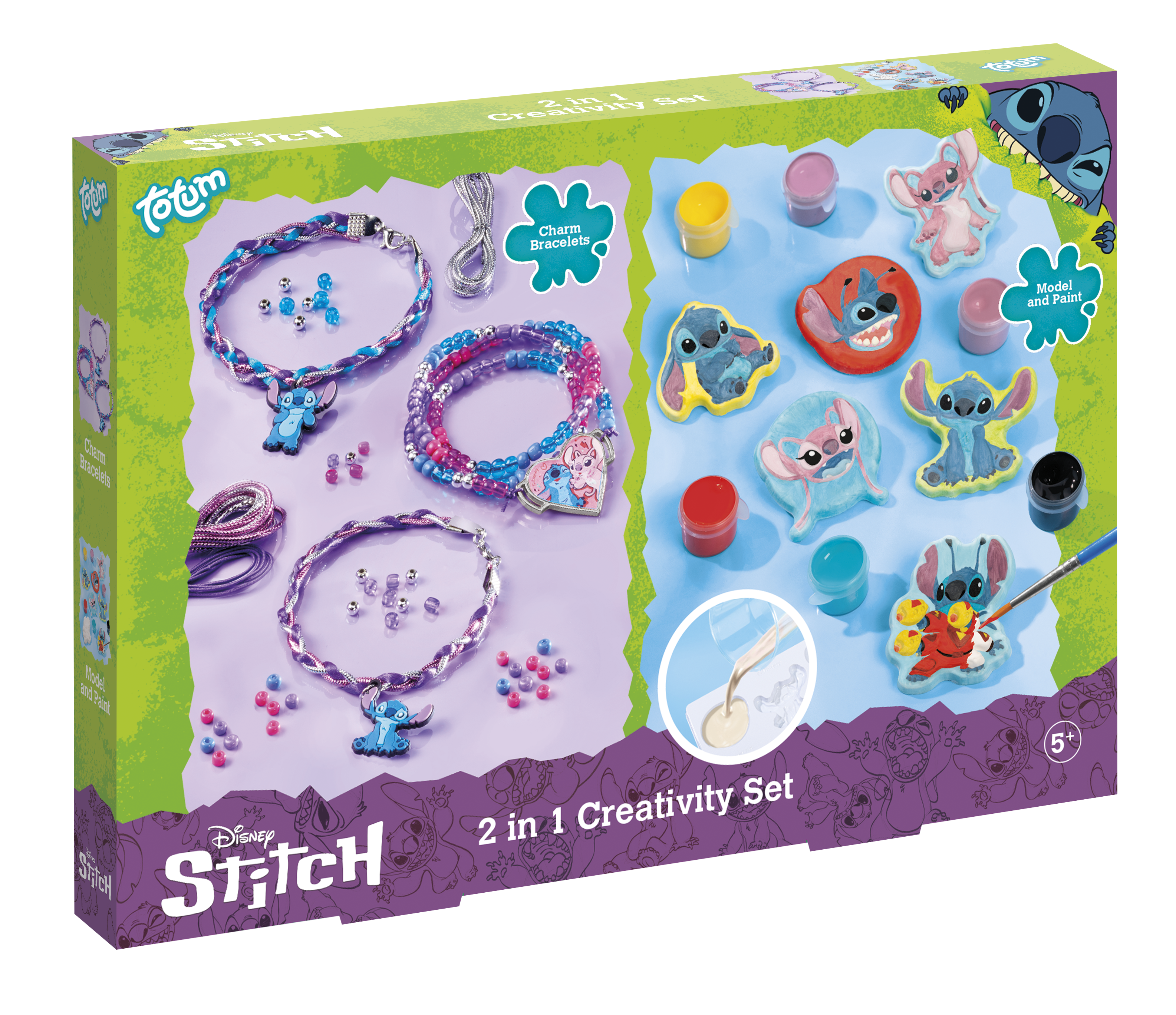 The Stitch – 2 in 1 Creativity Set combines two engaging Disney-themed activities in one kit, designed for children aged 5 and above. This set encourages imaginative play and skill development through bracelet-making and plaster figure crafting, featuring characters Stitch and Angel from Lilo & Stitch.