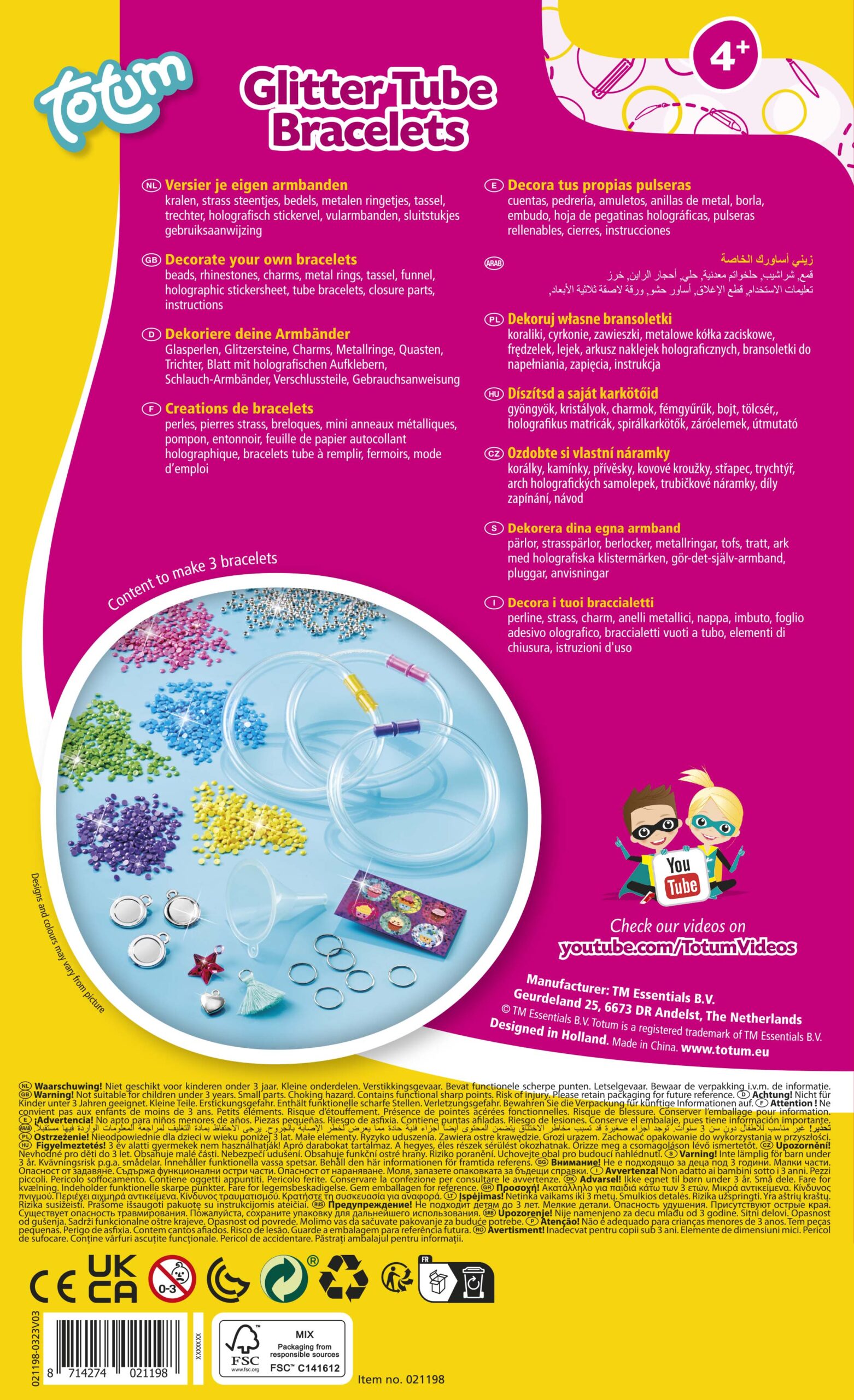 The set includes three transparent plastic tubes that form the bracelets. Use the included funnel to easily fill the tubes with your chosen mix of tiny, colourful beads. Once filled, securely attach the clasp and add a fun charm for the perfect finishing touch. You can create three different bracelets to wear and share with your friends.