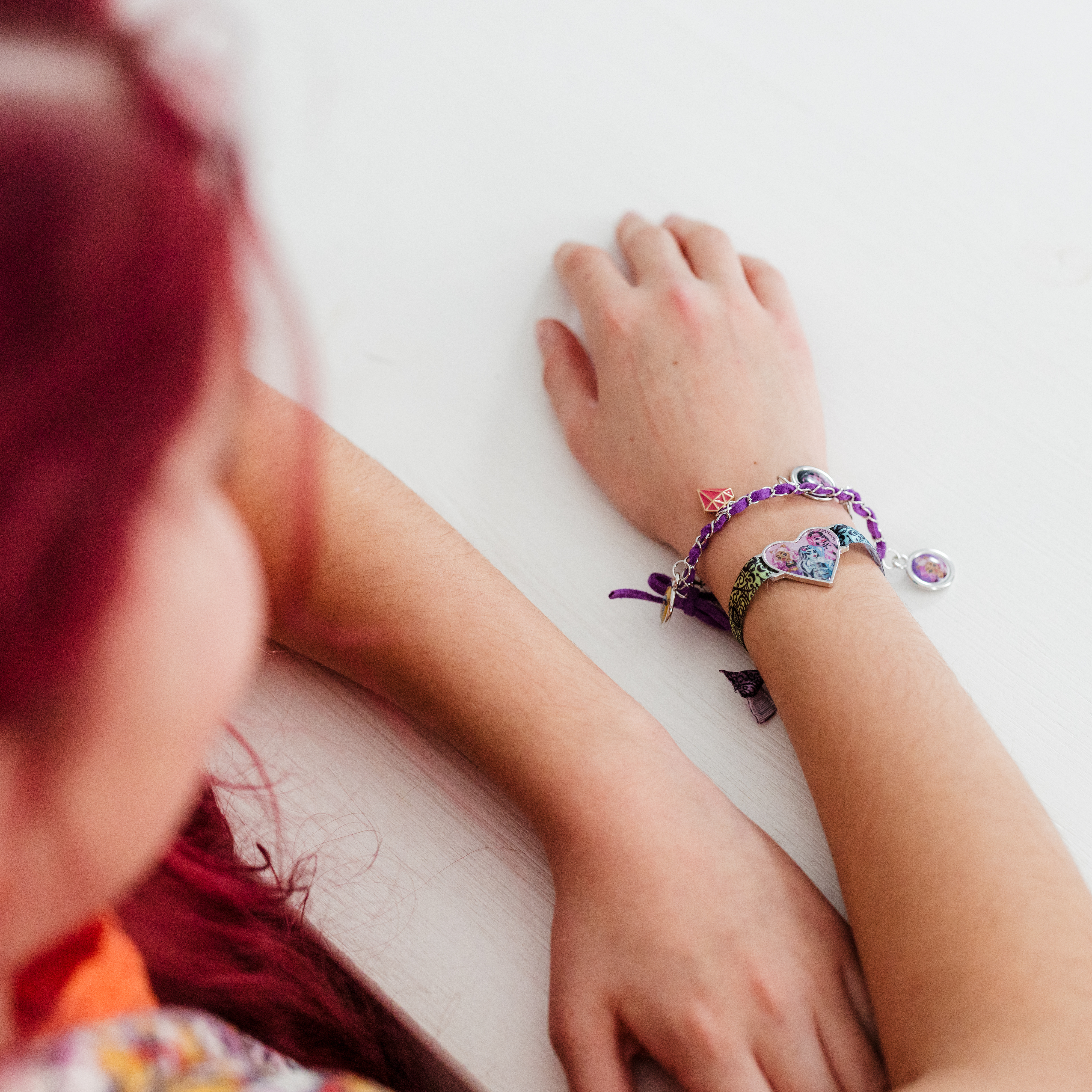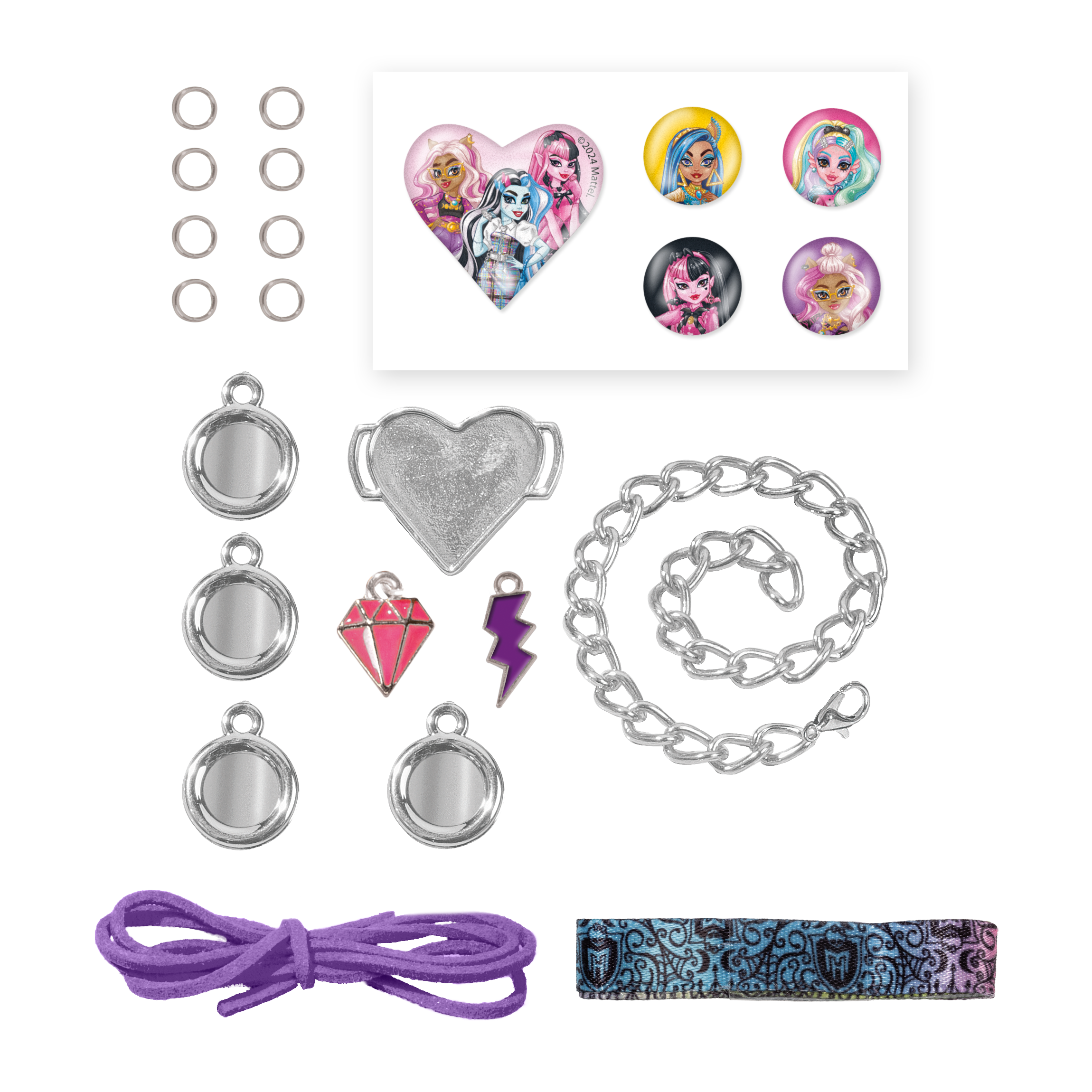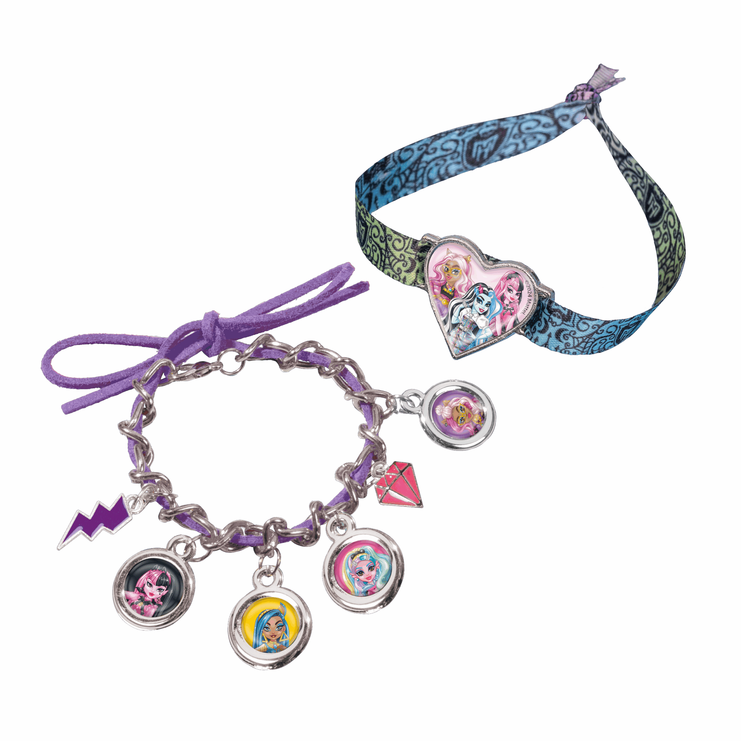 Create spooktacularly stylish accessories with the Totum Monster High Charm Bracelets kit. This boo-tiful set contains everything needed to make two unique bracelets, perfect for any fan of the ghoulish ghouls. One design is a metal link bracelet woven with a purple cord, which can be decorated with a variety of character charms. The second is a printed ribbon-style bracelet with a fashionable heart-shaped centrepiece.