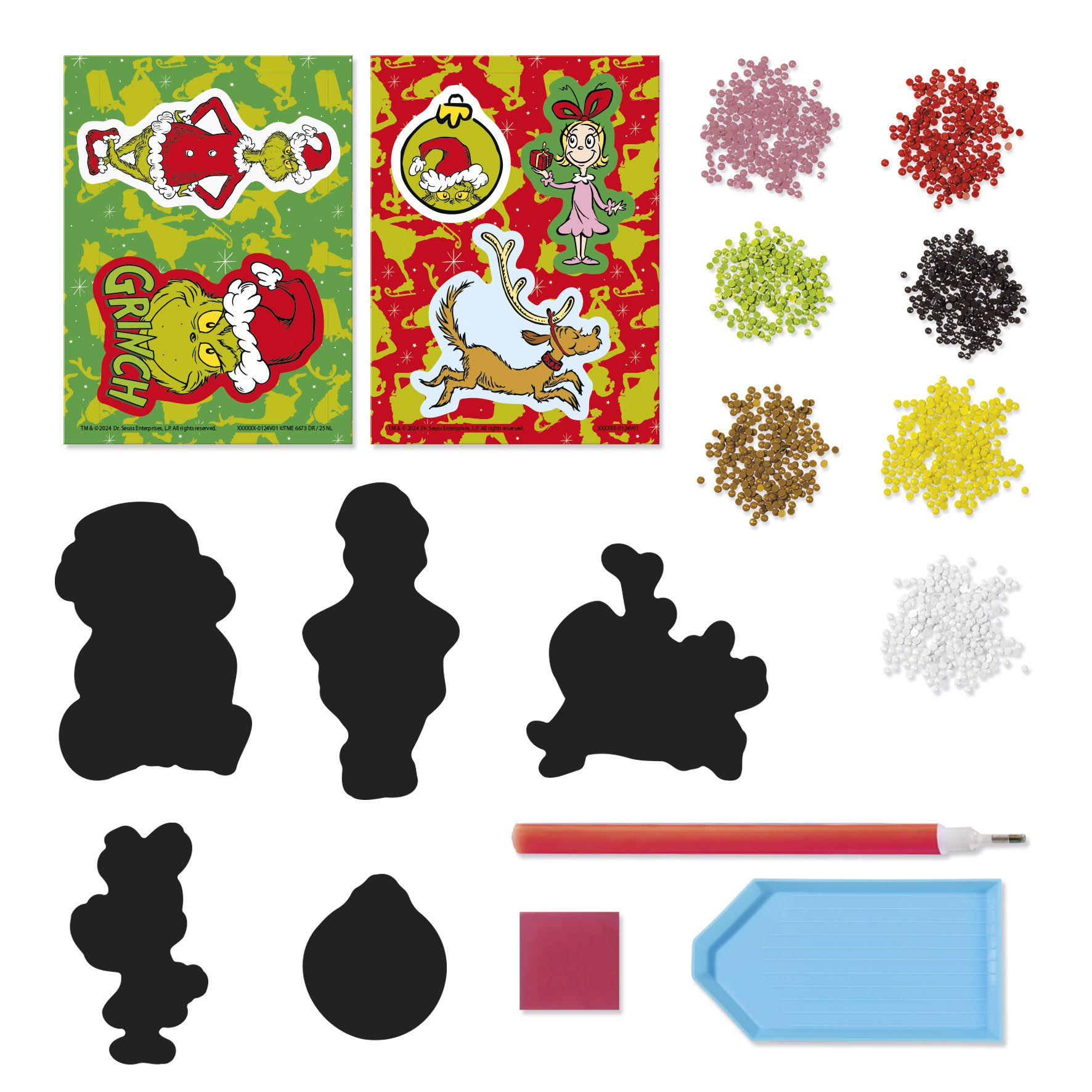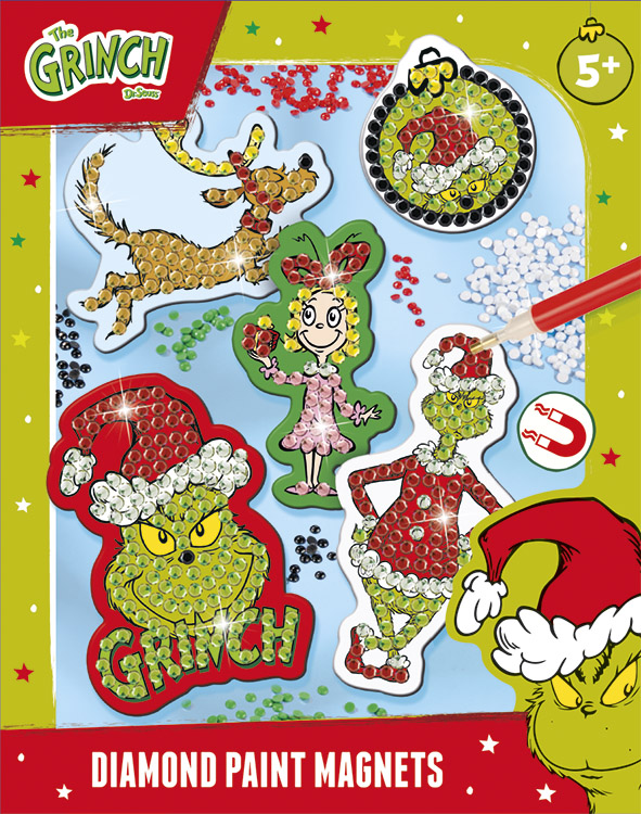 With over 1200 colourful gems, the applicator tool, and a handy sorting tray, this set is ready for hours of creative, mess-free fun. Simply place the gems onto the self-adhesive magnets to bring the Grinch, his dog Max, and Cindy Lou Who to shimmering life. The finished Grinch diamond painting magnets are perfect for displaying on the fridge or giving as special handmade gifts.