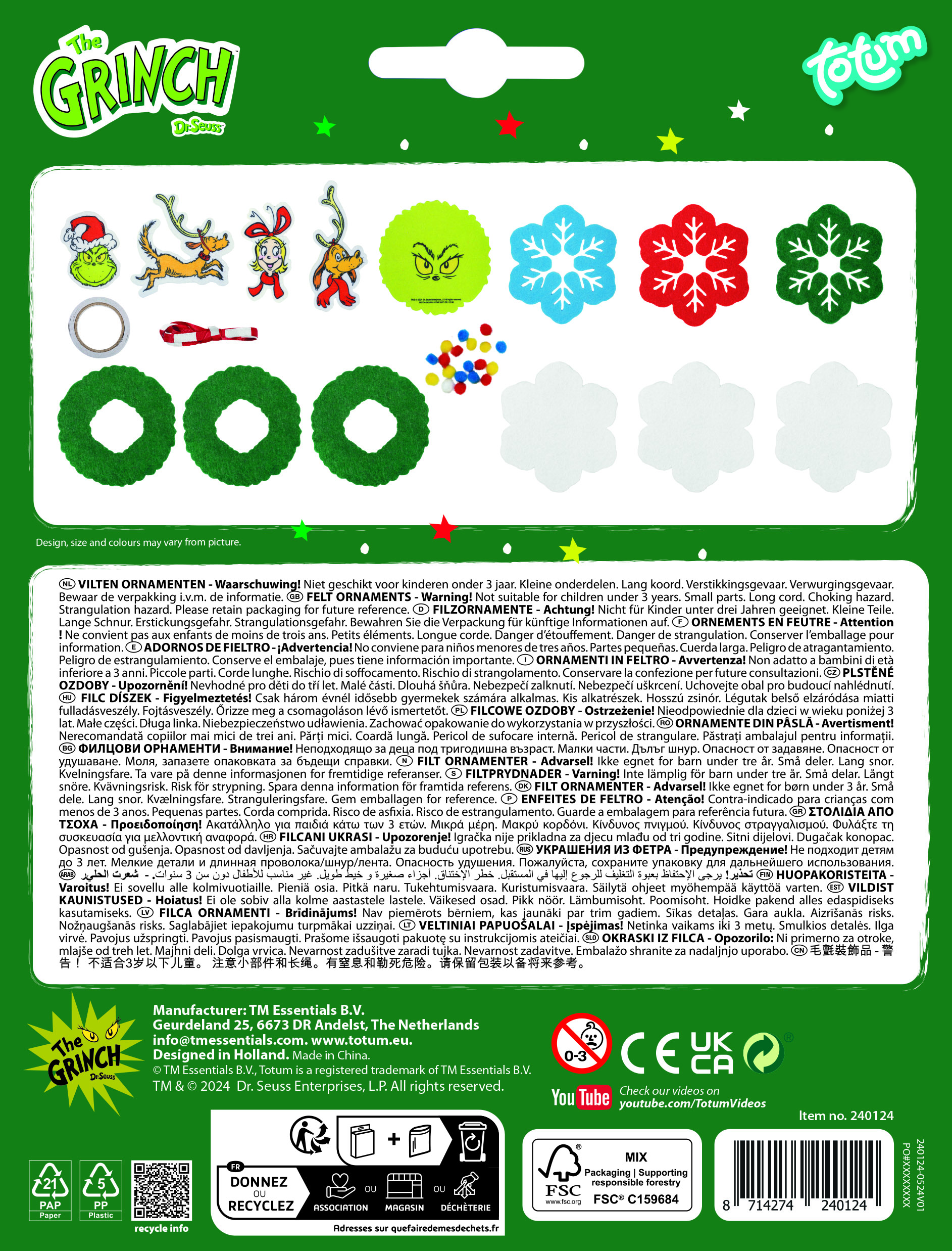 The set includes everything needed to assemble the five colourful decorations. Simply layer the pre-cut felt pieces, add the character details and decorate with the included pom-poms to create a fun, layered effect. With the candy-striped ribbons, The Grinch felt ornaments are ready to hang up straight away. It’s a wonderful pre-Christmas activity for any young fan of the classic story.