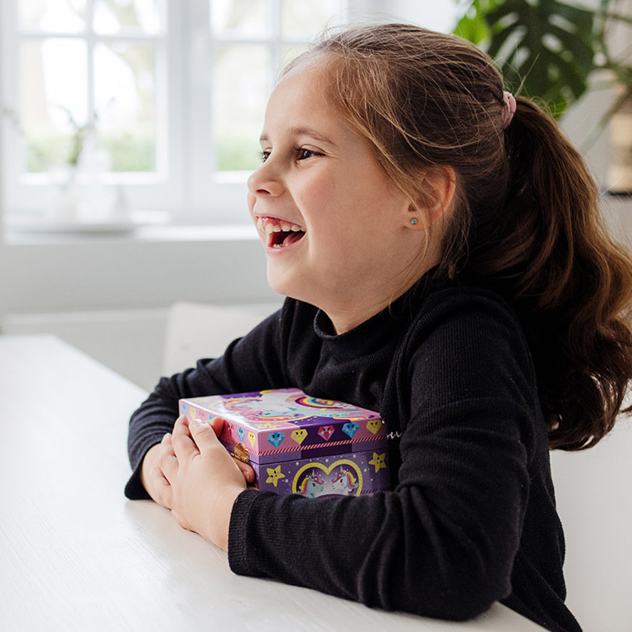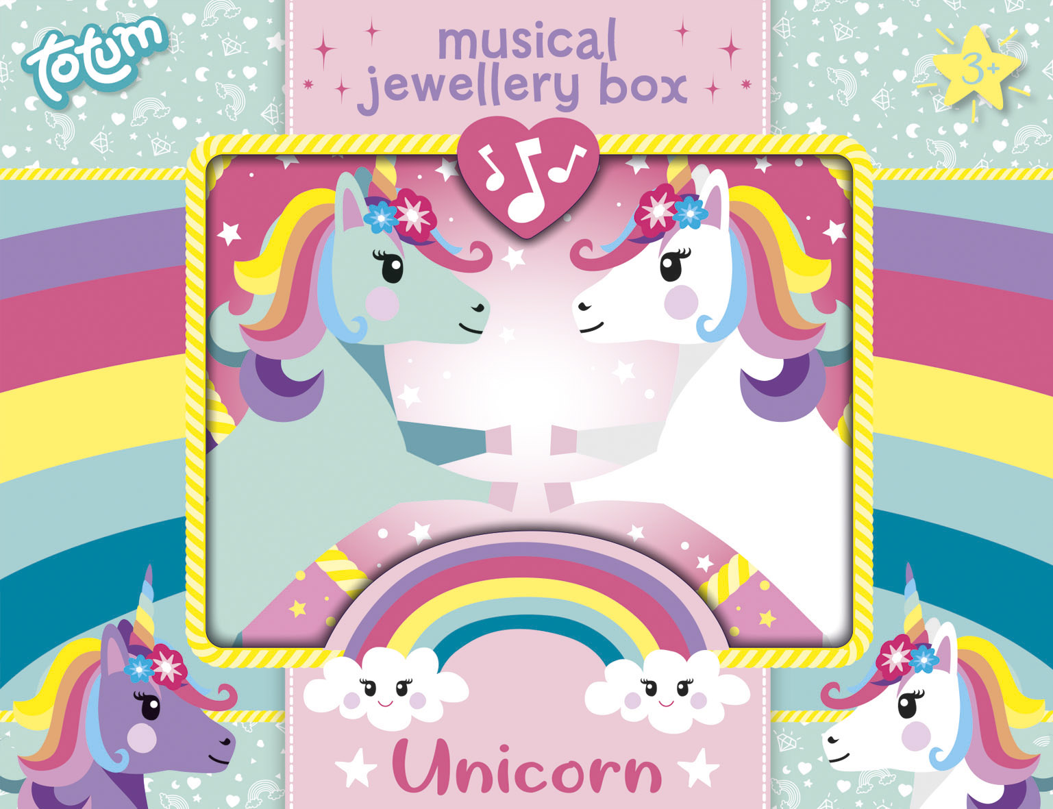 Keep all your precious trinkets and treasures safe in this magical Unicorn Musical Jewellery Box from Totum. This beautiful box is decorated with cheerful unicorns, smiling clouds, and bright rainbows, making it a wonderful addition to any bedroom.