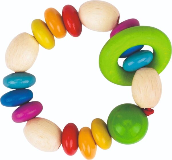 Engage your baby’s developing senses with the vibrant Heimess Rainbow Lens Wooden Touch Ring Rattle. Expertly crafted in Germany from sustainable wood, this colourful grasping toy is safe and stimulating for babies from birth onwards. The smooth wooden beads and unique lens-shaped pieces are strung securely on elastic, allowing gentle manipulation and exploration. Featuring a full spectrum of bright, rainbow colours alongside natural wood tones, it provides wonderful visual stimulation. The Heimess Rainbow Touch Ring encourages grasping and tactile discovery with its varied shapes and textures. As baby shakes the rattle, the wooden pieces clatter together softly, providing gentle auditory feedback. Made entirely with non-toxic, saliva-resistant paints and finishes, parents can be assured of its safety.