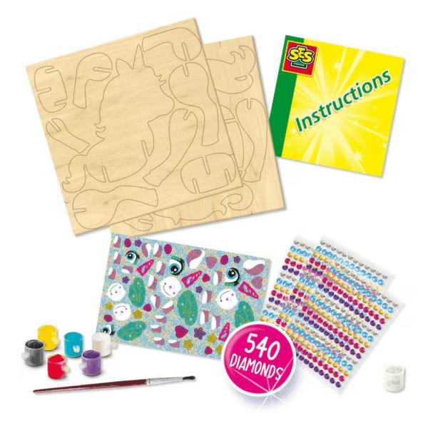• Contents: Wooden unicorn parts (2 figures), 6 paint colours, paintbrush, 540 self-adhesive diamond gems, instructions.